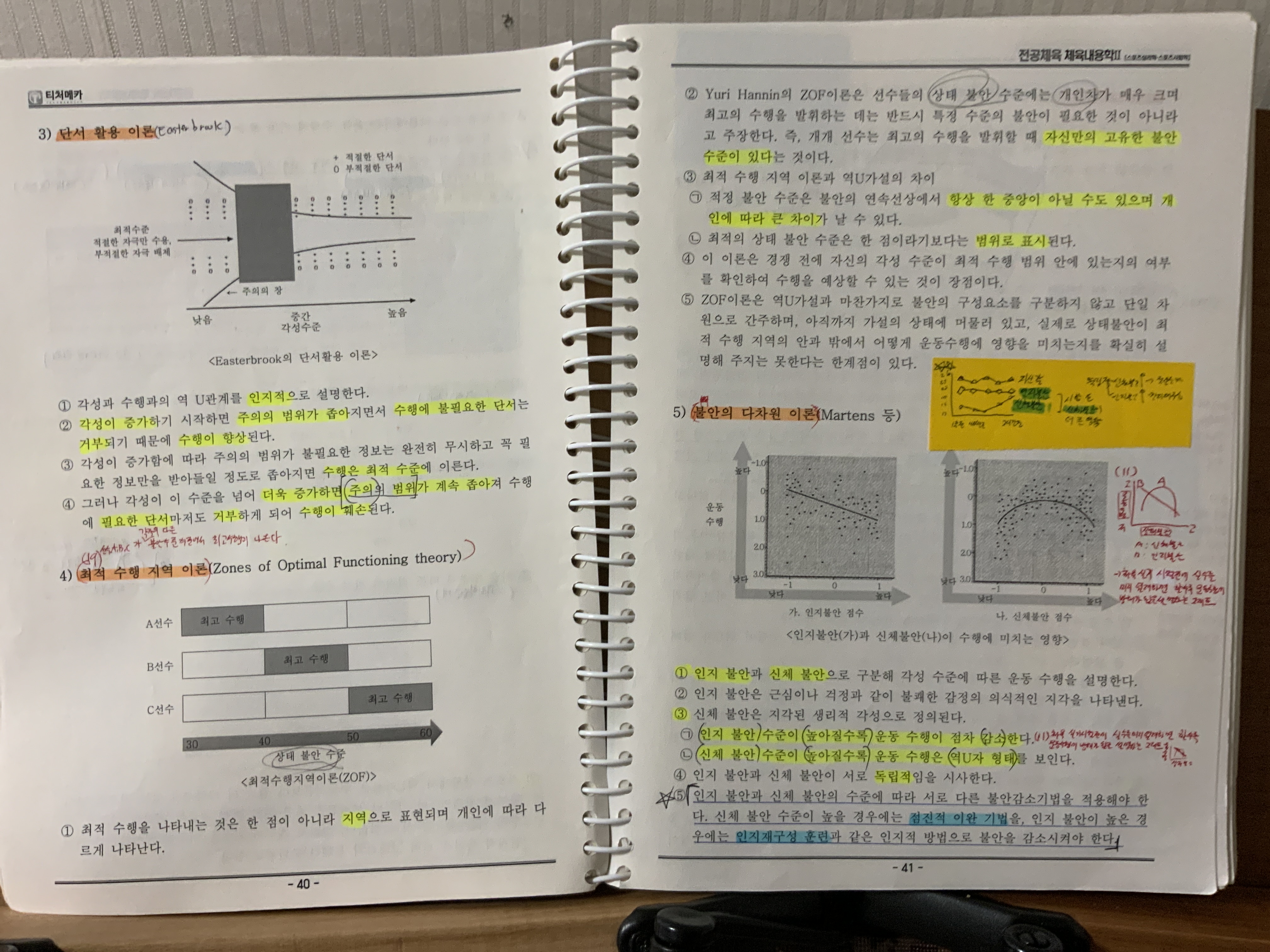 저의 책 사진은 심리학 파트의 불안 쪽 내용입니다. 필요한 만큼 빈칸을 뚫지만 현재 저건 저의 초창기 형태로 일단 긴가민가 한 건 다 손으로 써보자는 느낌으로 만들었습니다. 그리고 그래프도 보일 텐데 그래프 x축과 y축 내용 또한 헷갈린 건 빈칸으로 만들어놓았습니다. 그래프 내용 암기하는 데에도 많은 도움을 얻었습니다.